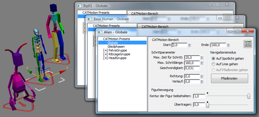 Sie können für jedes CAT-Rig in Ihrer Szene eine separates Fenster öffnen und die Einstellungen jederzeit bearbeiten, ohne das Rig erneut auswählen zu müssen. Dies kann sich bei der Arbeit mit mehreren Rigs als praktisch erweisen.