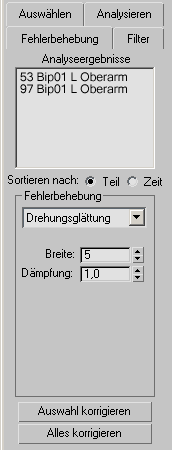 - Zeigt alle Fehler an, die bei der Analyse für die ausgewählten Körperteile gefunden wurden. Dem Namen des Biped-Objekts ist die Frame-Nummer des Fehlers vorangestellt. Durch einmaliges Klicken auf den Fehler wird in der Kurvenansicht bei diesem Frame eine gelbe Linie angezeigt. Durch zweimaliges Klicken wird das aktuelle Frame auf die Nummer des Fehler-Frames gesetzt, wodurch in den Ansichtsfenstern dieses Frame ebenfalls angezeigt wird.