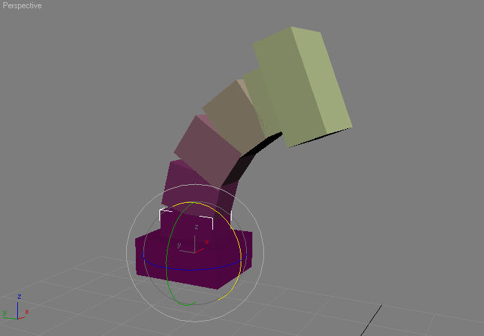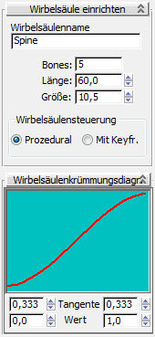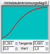 Die Einstellungen des Rollouts "Wirbelsäulenkrümmung" bestimmen, wie weit die Wirbelsäulenverbindungen relativ zueinander gedreht werden. Mit anderen Worten wird gesteuert, wie die Drehung der Hubs zueinander entlang der Wirbelsäule verteilt wird.