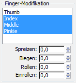 Der Bereich "Finger-Modifikatoren" stellt Hilfsmittel zur Manipulation der Finger bereit, entweder einzeln oder als Gruppe. Mithilfe der Zahlenauswahlfelder für "Spreizen", Biegen", "Rollen" und "Krümmen" können Sie die ausgewählten Finger parametrisch transformieren.