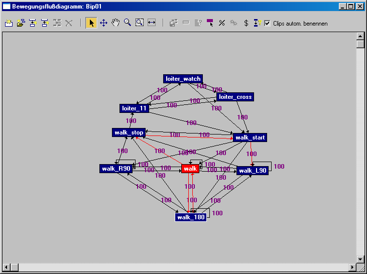 Der erste Schritt im Bewegungsflussmodus besteht darin, Clips für die Verwendung in Skripts im Bewegungsflussdiagramm hinzuzufügen. Ein Clip entspricht dem Inhalt einer BIP-Datei oder Teilen davon. Ein Skript ist ein möglicher Pfad durch die Clips im Bewegungsflussdiagramm. Der erste Clip im aktuellen Skript ist rot. Übergänge werden als Pfeile zwischen Clips angezeigt, wobei rote Pfeile den Pfad durch das aktive Skript kennzeichnen. Die schwarzen Übergangspfeile weisen auf nicht geladene Skripts hin. Übergänge, die zum gleichen Clip zurückweisen, stehen für eine Schleife.