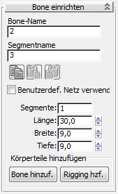 Die Benutzeroberfläche für die Bearbeitung der Glied-Bones besteht aus zwei Rollouts: "Bone einrichten" und "Bone-Verdrehungsgewichtung".