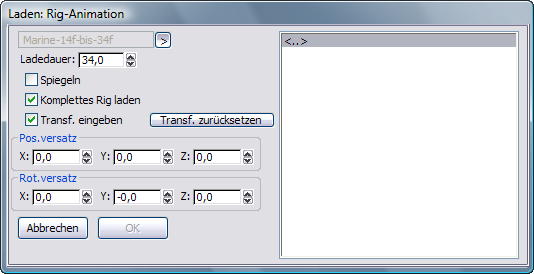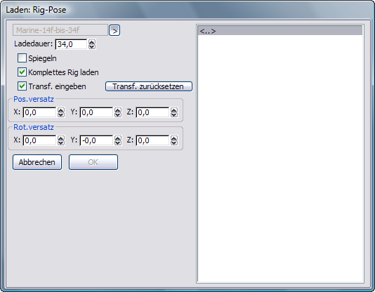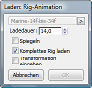 Alle Parameter zum Laden einer Stellungs- oder Animationsdatei sind einstellbar. Sie können die geladene Datei, den Zeitpunkt des Laden sowie alle anderen Parameter ändern, die das Laden der Stellung betreffen. Als Animator haben Sie die Möglichkeit, den Zeitschieber hin- und herzubewegen und das von den geladenen Stellungs- oder Animationsdaten gelieferte Ergebnis zu betrachten, um die geladene Stellung vor der Bestätigung durch OK auf Tauglichkeit zu prüfen.