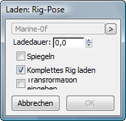 "Pose laden" ist wie alle Dialogfelder dieser Funktion modusunabhängig. Während Sie die Parameter der geladenen Stellung bearbeiten, können Sie also das Ansichtsfenster drehen, den Zeitschieber ziehen und das Ergebnis überprüfen. Als einzige Ausnahme führt die Aufhebung der Auswahl eines Bones zum Abbruch des Ladevorgangs.