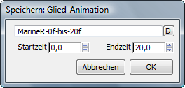 Der Name der Animation, die gespeichert werden soll. Der Dateiname wird vom Namen des gespeicherten Körperteils und dem Frame abgeleitet, bei dem die Datei gespeichert wird.