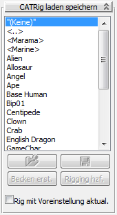 Sie können jederzeit ein benutzerdefiniertes CAT-Rig als neue Rig-Einstellung zur späteren Wiederverwendung speichern. Dies ist eine gängige Methode in CAT: Sie laden die Einstellung, die Ihren Anforderungen am ehesten gerecht wird, passen sie für Ihre Zwecke an und speichern das Ergebnis dann als neue Einstellung.