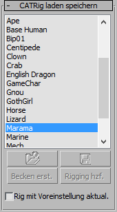 Sie können ein CAT-Rig zwar auch von Grund auf neu erstellen, in der Regel ist es jedoch einfacher, das Ihren Anforderungen am ehesten entsprechende Rig zu laden und auf dieser Grundlage weiterzuarbeiten.
