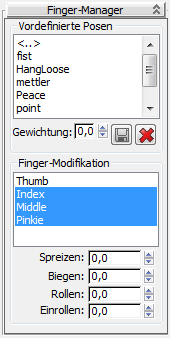 Sie können die Finger zwar auch direkt transformieren, die Verwendung des Finger-Managers bietet sich aber an. Die Steuerelemente bieten Ihnen die Möglichkeit zur Anpassung von Spreizung, Biegung, Rollen und Krümmung der ausgewählten Finger. Außerdem verfügt der Finger-Manager über einen integrierten Poseneinstellungsmanager.