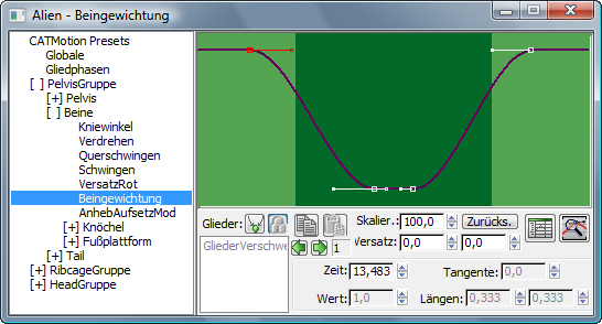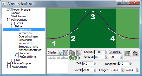 Der Gehzyklus wird in vier Kniewinkel aufgeteilt. Die Steuerung der Kniewinkel läuft über den Controller "Kniewinkel", der im CATMotion-Editor unter "Beine" zu finden ist.