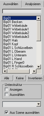 Wenn "Aus Szene auswählen" aktiviert ist, können Sie auf die Biped-Teile direkt im Ansichtsfenster klicken, anstatt sie in der Liste zu markieren. Die Kurven werden sofort in der Labor-Kurvenansicht angezeigt. Diese Funktion ist besonders praktisch, wenn der Name des auszuwählenden Teils nicht bekannt ist.