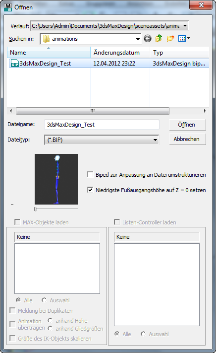 Beim Laden von FIG-Dateien (im Figurmodus) wird das Standard-Windows-Dialogfeld "Öffnen" angezeigt. Wenn Sie jedoch eine BIP- oder STP-Datei laden, können Sie eine Vorschau der Animation anzeigen und steuern, wie viele Informationen in Ihren Biped geladen werden.