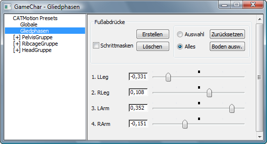 Der obere Abschnitt des Fensters enthält Steuerelemente für Fußabdrücke und der untere Phasenregler zur Steuerung der relativen Bewegung der Glieder.