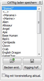 Das Rollout "CATRig laden speichern" zeigt eine Liste vorhandener Vorgabe-CAT-Rigs an und stellt Steuerelemente zur Arbeit mit diesen bereit.