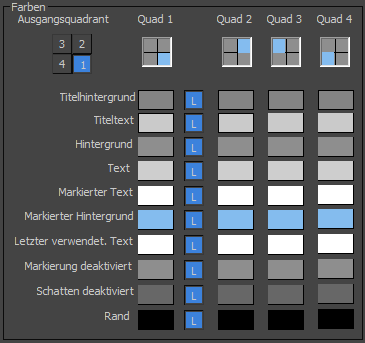 Wenn die Farben für ein Quad-Menüelement gesperrt sind (erkennbar an einer gedrückten "S"-Schaltfläche), hat jeder der separaten Quadranten die gleiche Farbe, d. h., wenn Sie die Farbe eines Quadranten ändern, werden die Farben aller Quadranten geändert.