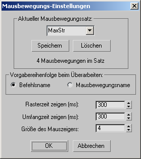 Im Dialogfeld "Mausbewegungs-Einstellungen" können Sie Mausbewegungssätze speichern und weitere Eigenschaften für Mausbewegungen einstellen.