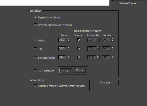 Anmerkung: Zum Anzeigen des Bereichumrisses im Ansichtsfenster muss Sichere Frames in aktiver Ansicht zeigen aktiviert sein.