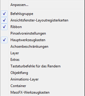 Das Kontextmenü zum Anpassen der Anzeige wird angezeigt, wenn Sie in einem leeren Bereich eines Werkzeugkastens (nicht über einer Schaltfläche) oder bestimmte Teile der Befehlsgruppe mit der rechten Maustaste klicken. Mithilfe dieses Menüs können Sie verschiedene Elemente der Benutzeroberfläche ein- oder ausschalten, die Anzeige der Werkzeugkästen anpassen und Elemente wie die Befehlsgruppe fixieren oder frei verschiebbar machen.