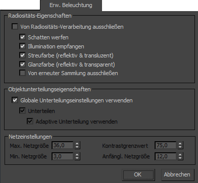 Weitere Informationen zum Bereich "Radiositäts-Eigenschaften" finden Sie unter Radiositäts-Steuergruppe.