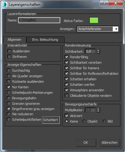 Das Dialogfeld "Layereigenschaften" ähnelt dem Dialogfeld "Objekteigenschaften". Sie können in diesem die Einstellungen für das Rendern, die Bewegungsunschärfe und die Anzeige eines oder mehrerer ausgewählter Layer ändern. Zudem besteht die Möglichkeit, die erweiterten Lichteinstellungen zu ändern oder einen oder mehrere ausgewählte Layer auszublenden/einzufrieren.
