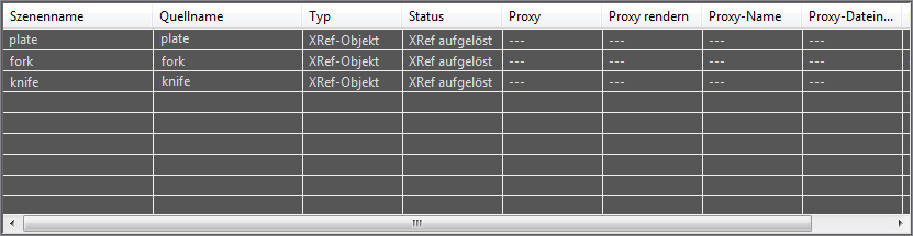 In diesem Bereich werden die XRef-Objekte, Controller und Materialien angezeigt, die zu dem aktuell markierten Datensatz in der Liste der XRef-Datensätze gehören. Sind keine Quelldateien markiert, ist die Liste leer.