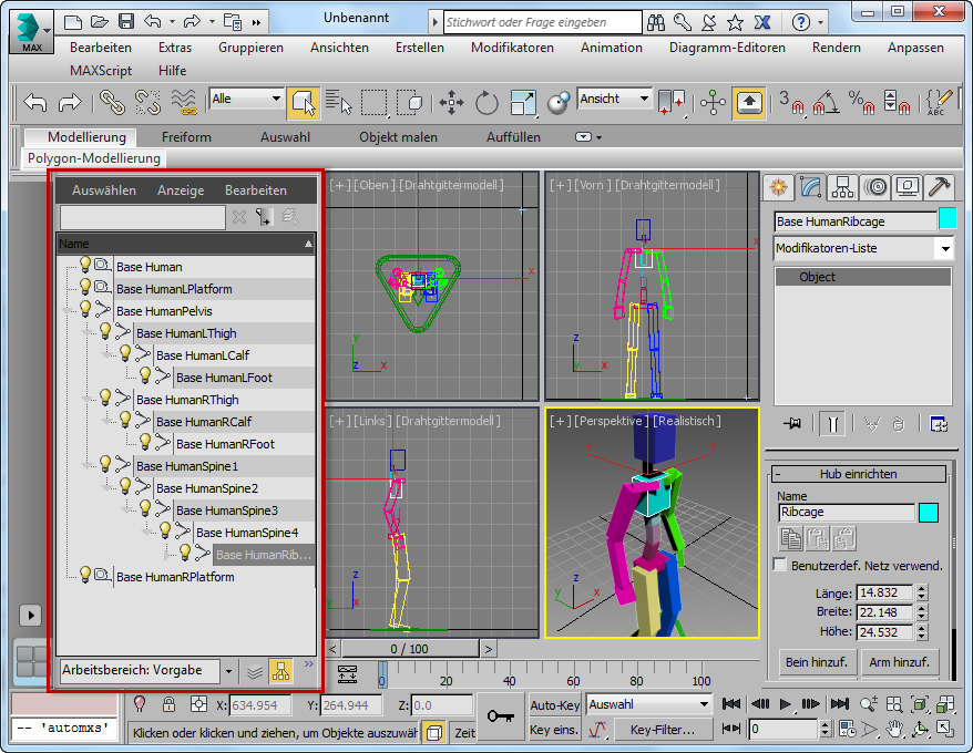 Arbeitsbereich-Szenen-Explorer (rot umrandet), auf der 3ds Max-Benutzeroberfläche fixiert