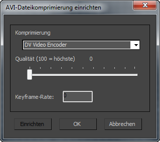 Wenn AVI als Ausgabeformat gewählt ist, wird durch Klicken auf "Rendern" oder "Setup" im Dialogfeld "Render-Ausgabedatei" das Dialogfeld "Video-Komprimierung" angezeigt.