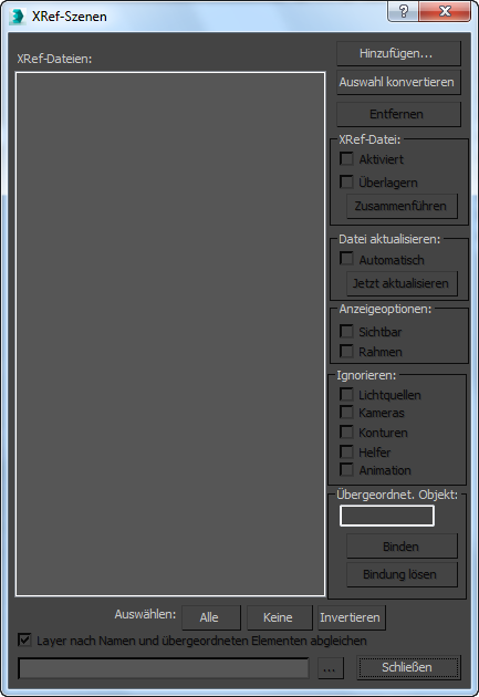 Hier können Sie die Kategorien festlegen, die nicht in die XRef-Szene integriert werden sollen. Wenn Sie hier beispielsweise Lichtquellen aktivieren, werden die Lichtquellen der XRef-Quellszene nicht in die aktuelle Szene, die Zielszene, integriert. Sie können diese Kategorien beliebig aktivieren bzw. deaktivieren. Wenn Sie jedoch eine XRef-Szene zusammenführen, wenn eine Kategorie deaktiviert ist, wird diese Objektkategorie nicht in der Szene zusammengeführt.