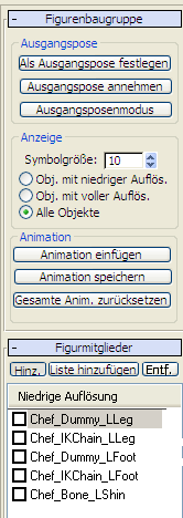 Die Animation für die Figurenbaugruppe kann in dieser Gruppe gespeichert oder zurückgesetzt werden. Eine zuvor gespeicherte Animation von einer anderen Figur kann ebenfalls in die aktuelle Figurenbaugruppe eingefügt werden.
