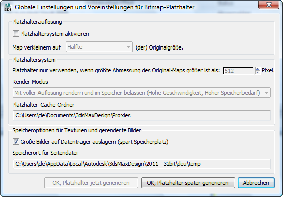 - Platzhaltersystem aktivieren Mit dieser Option aktivieren Sie die Verwendung des Platzhaltersystems. Wenn diese Option deaktiviert ist, verwendet 3ds Max ausschließlich die ursprünglichen Maps mit voller Auflösung. Diese Option ist nur in der Global-Version des Dialogfelds verfügbar.