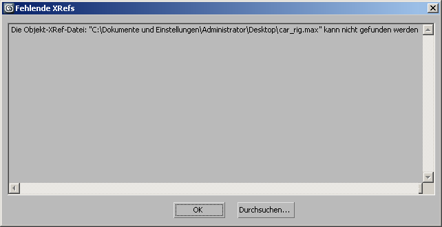 Wenn Sie eine Szene mit XRefs laden oder rendern, der ursprünglich festgelegte Pfad des XRef-Objekts jedoch nicht gefunden werden kann, oder wenn der Name des XRef-Objekts nicht mit dem Objektnamen in der Quelldatei übereinstimmt, erhalten Sie eine entsprechende Warnmeldung.