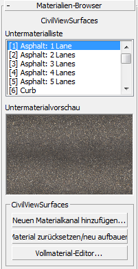 Andere Bereiche in diesem Rollout hängen davon ab, welches Civil View-Material Sie ausgewählt haben. Die verfügbaren angezeigten Elemente umfassen: