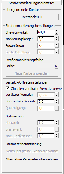Wenn eine Straßenmarkierung über eine Bodenoberfläche drapiert wird, muss sie, um sichtbar zu sein, leicht über die zugrunde liegende Oberfläche angehoben werden. Das Rollout Szeneneinstellungen verfügt dafür über eine globale Einstellung. Es kann vorkommen, dass einzelne Straßenmarkierungsobjekte etwas weiter angehoben werden müssen, um ungewöhnlichen Konturen in der zugrunde liegenden Oberfläche gerecht zu werden. Deaktivieren Sie in diesem Fall die Option Globalen vertikalen Versatz verwenden und legen Sie einen lokalen Wert fest.