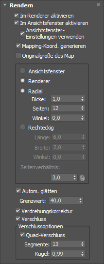 Wenn die Option "Im Renderer aktivieren" aktiviert ist, wird die Kontur mit einem kreisförmigen oder rechteckigen Querschnitt gerendert. Beim Generieren der Mapping-Koordinaten erfolgt ein einfaches U-Mapping um den Durchmesser und ein einfaches V-Mapping an der Länge.