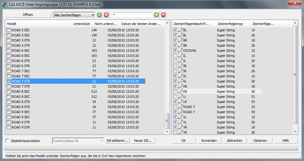 Listet die Modelle in der 12D Model-Datei. Klicken Sie auf ein Modell, um es zu markieren. Sie können nur jeweils ein Modell markieren. Nichtsdestotrotz können Sie Zeichenfolgen aus mehreren Modellen auswählen, bevor Sie die Konfiguration in der Modelldatei-Importgruppe abschließen.