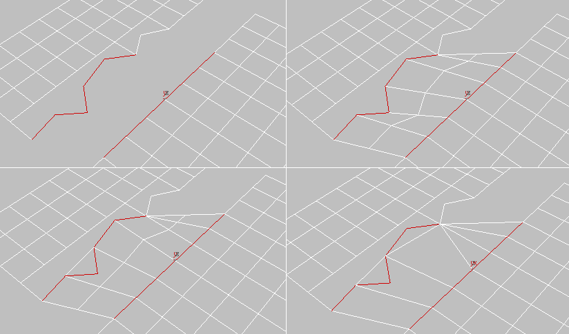 Beim Überbrücken von zwei Kantenauswahlen, die unterschiedlich viele Kanten enthalten, können Sie eine von zwei Methoden zur Triangulierung der Brückenpolygone verwenden. Mit diesem Wechselschalter können Sie zwischen den beiden Verfahren wechseln.