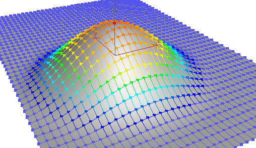 Dieser Falloff wird in den Ansichtsfenstern als Farbverlauf um die Auswahl dargestellt, der dem ersten Teil des Standardfarbspektrums ROYGB (rot, orange, gelb, grün, blau) entspricht. Explizit ausgewählte Unterobjekte sind rot. Die mit der weichen Auswahl gewählten Unterobjekte mit dem höchsten Wert sind rötlich-orange. Sie haben denselben Auswahlwert wie die roten Unterobjekte und reagieren auf die gleiche Weise auf Bearbeitungen. Orange Unterobjekte haben einen etwas niedrigeren Auswahlwert und reagieren auf Bearbeitungen weniger stark als rote und rötlich-orange Scheitelpunkte. Gelb-orange Unterobjekte haben einen noch niedrigeren Auswahlwert, gefolgt von gelben, grün-gelben usw. Blaue Unterobjekte sind praktisch nicht ausgewählt und reagieren nicht auf Bearbeitungen, außer bei Bedarf auf benachbarte, weich ausgewählte Unterobjekte.