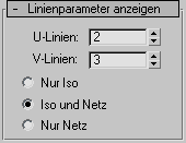 Die Anzahl der zum Annähern der NURBS-Oberfläche in Ansichtsfenstern verwendeten Linien in Richtung der lokalen U- bzw. V-Dimension der Oberfläche. Durch Herabsetzen dieser Werte wird zwar die Anzeige der Oberfläche beschleunigt, aber gleichzeitig auch die Präzision der Anzeige herabgesetzt. Ein Erhöhen dieser Werte führt zu einer größeren Präzision auf Kosten der Zeit. Wenn Sie einen dieser Werte auf 0 setzen, wird nur die Objektkante im entsprechenden Maß angezeigt.