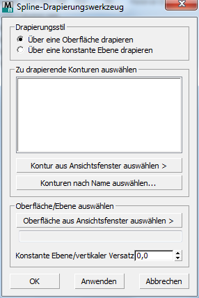 Geben Sie an, ob Sie die ausgewählten Konturobjekte auf eine ausgewählte Oberfläche oder auf eine bestimmte Ebene oder Erhebung drapieren möchten.