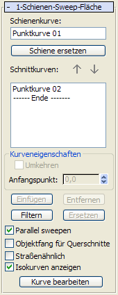 Während ein 1-Schienen-Sweep-Unterobjekt ausgewählt ist, wird ein Rollout mit den Parametern des 1-Schienen-Sweep eingeblendet. Dieses Rollout wird nur angezeigt, wenn genau ein 1-Schienen-Sweep-Unterobjekt markiert ist. Sie können jeweils nur einen 1-Schienen-Sweep bearbeiten; deshalb wird dieses Rollout im Gegensatz zu anderen NURBS-Unterobjekten nicht angezeigt, wenn mehrere 1-Schienen-Sweep-Unterobjekte ausgewählt sind.