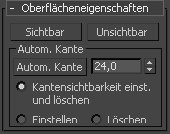 Diese Steuerelemente beeinflussen die Sichtbarkeit der Kanten. Unsichtbare Kanten (auch als Konstruktionslinien bezeichnet) werden in den Ansichtsfenstern angezeigt, wenn die Option "Nur Kanten" in der Anzeigegruppe deaktiviert ist oder wenn Sie sich auf der Unterobjektebene "Kante" befinden. Die Sichtbarkeit von Kanten ist vor allem dann von Bedeutung, wenn ein Objekt mit einem Drahtgittermodell-Material gerendert wird.