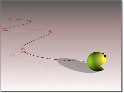 Die roten Quader kennzeichnen die Keyframes, die gestrichelte Linie zeigt die interpolierte Bewegungsbahn.