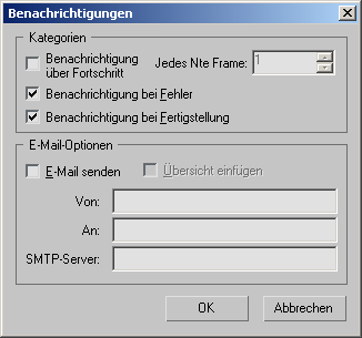 Über dieses Dialogfeld kann ein Renderauftrag im Netzwerk Benachrichtigungen per E-Mail versenden. Solche Benachrichtigungen können nützlich sein, wenn Sie einen zeitaufwendigen Rendervorgang starten, beispielsweise eine Animation, sich aber nicht ständig am Netzwerk-Manager-System aufhalten möchten.