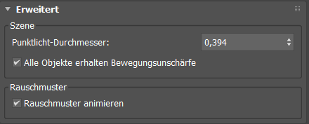 - Variiert das Rauschmuster für jedes Frame einer animierten Render-Ausgabe. Dies ist für hochwertige Animations-Render-Ausgaben erwünscht, da dabei ein natürlicheres Aussehen ähnlich einer Filmkörnung entsteht.
