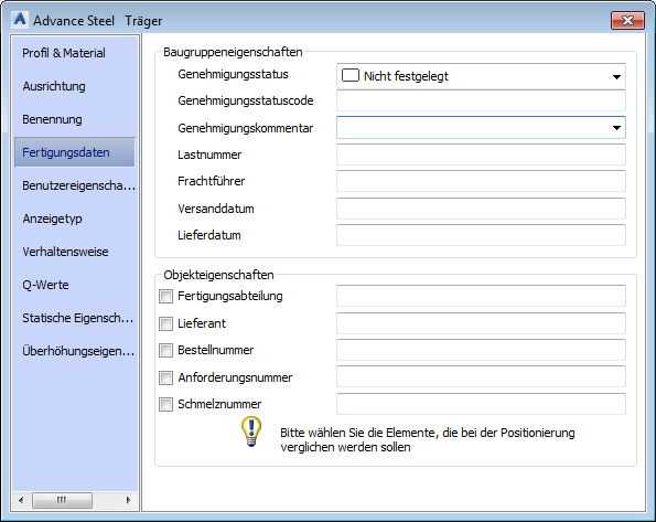 Fertigungsdaten für Objekte sind immer verfügbar und werden für jedes Objekt einzeln definiert, auch wenn einige Objekte dieselbe Positionsnummer aufweisen.