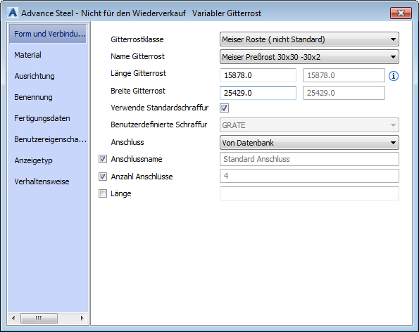 Auf dieser Registerkarte des Dialogfelds für Gitterrost-Eigenschaften können Sie die Gitterrostklasse und die Größe gemäß der gewählten Klasse auswählen.
