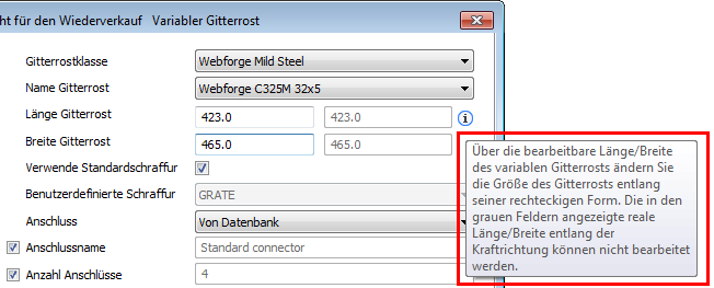 Anmerkung: Im Dialogfeld Variabler Gitterrost wird eine QuickInfo angezeigt, wenn Sie den Mauszeiger über das Ausrufezeichen rechts neben dem ausgegrauten Feld Gitterrost-Länge ziehen. Die QuickInfo enthält Erklärungen zu den beiden Längen-/Breitenfeldern.