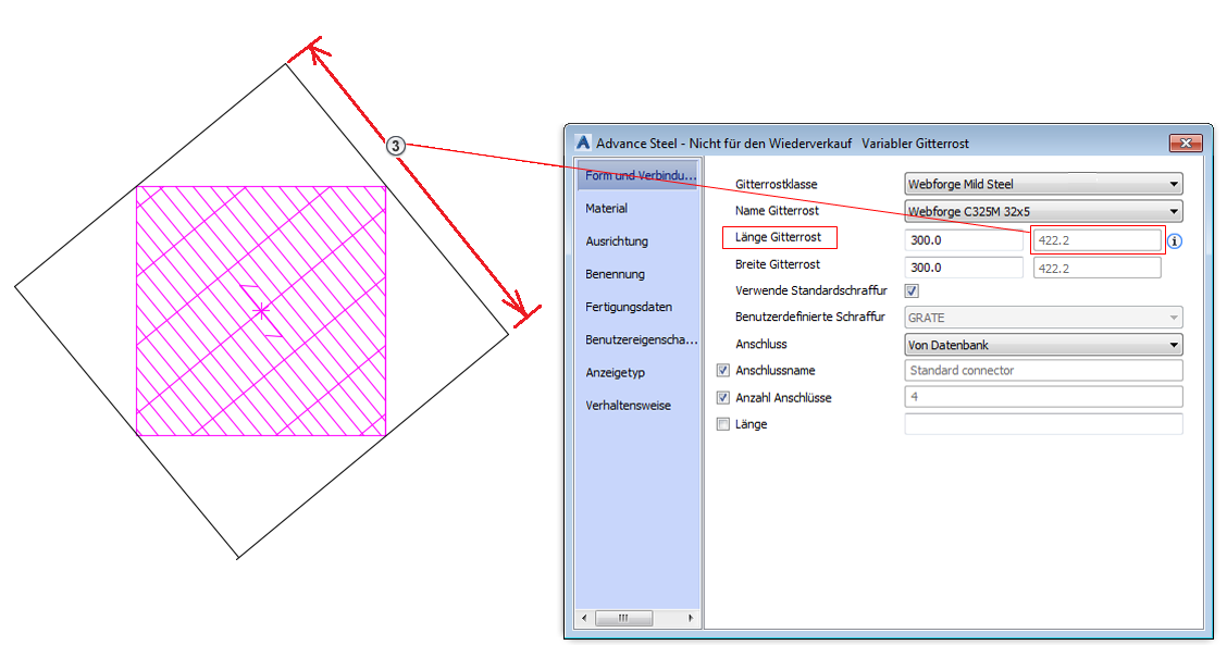 Grau angezeigte Werte: Zeigt die berechnete Länge des Begrenzungsrahmens für den variablen Gitterrost an. Diese Werte werden anhand des Rechtecks mit der kleinsten Fläche berechnet, das in das Rechteck für den modellierten Gitterrost passt und an dessen Lastrichtung ausgerichtet ist. Die Größe dieses Gitterrosts ist von Bedeutung, da der Gitterrost aus einem Stück Gitter gefertigt wird, dessen Lastrichtung in seiner Längsrichtung ausgerichtet ist. Anschließend wird er für den benötigten modellierten Gitterrost passend zugeschnitten. Bearbeitbare Werte: Dieser Wert ändert die sichtbare Form des rechteckigen Gitterrosts in Richtung des Längenwerts, wobei die Lastrichtung ignoriert wird. |