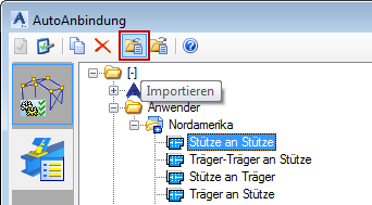 Sie können Einstellungen auf jedem Computer importieren, auf dem dieselbe Version von Advance Steel ausgeführt wird. Verwenden Sie hierfür den Befehl Importieren in der Symbolleiste des Dialogfelds für schnelle Anschlüsse.