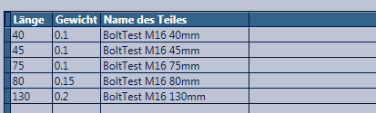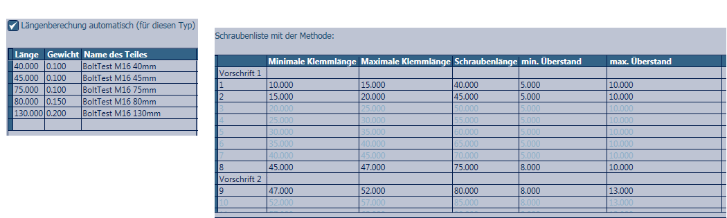 In der Tabelle der Registerkarte Schrauben waren die definierten Schraubenlängen 40 mm, 45 mm, 75 mm, 80 mm und 130 mm. Daher werden die Regeln für diese speziellen Schraubenlängen definiert.