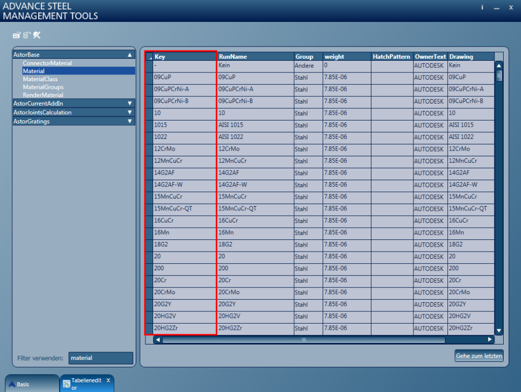 Gruppe Einstellungen klicken. Öffnen Sie in der Management Tools-Anwendung den Tabelleneditor, klicken Sie auf die Schaltfläche in der oberen rechten Ecke (ODBC öffnen), um die Advance Steel Datenbanken zu laden, und suchen Sie mithilfe des Filters unten rechts nach "Material". Rufen Sie die Materialtabelle unter AstorBase auf, um die Materialschlüssel anzuzeigen: